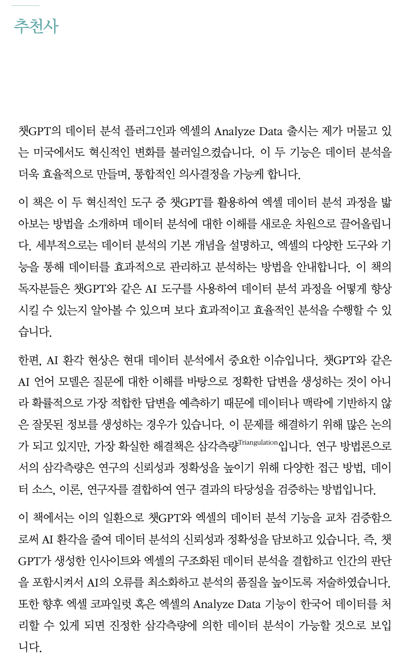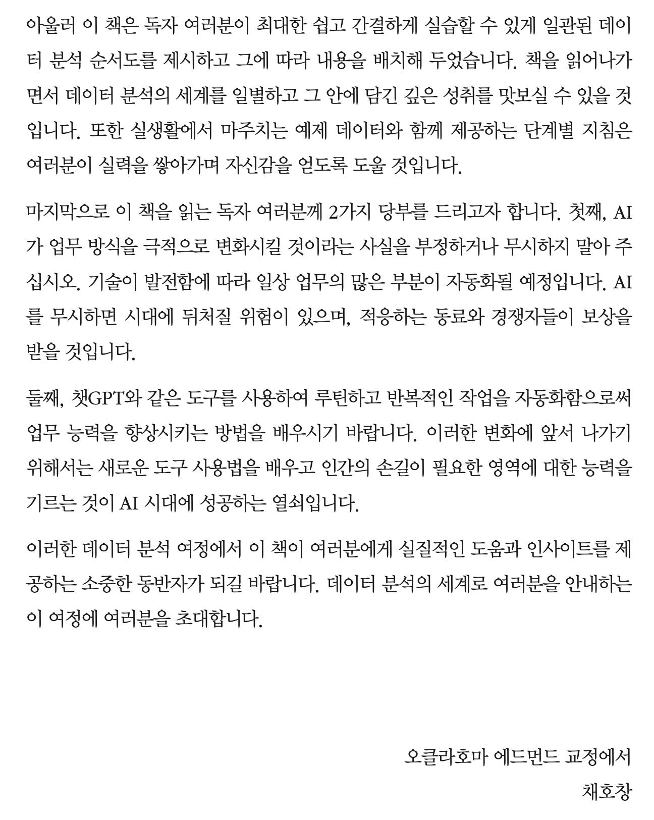 저와 채호창 교수님, 신경민 팀장님이 같이 쓴 저희의 세번째 책 [엑셀 데이터 분석 with 챗GPT]에서 미국 주립대 지도교수님이셨던 채 교수님의 추천사를 공유합니다. 책에 있는 내용이지만 저자인 제 블로그에 공유해도 될 수 있는 내용은 여기서 공유하겠습니다.