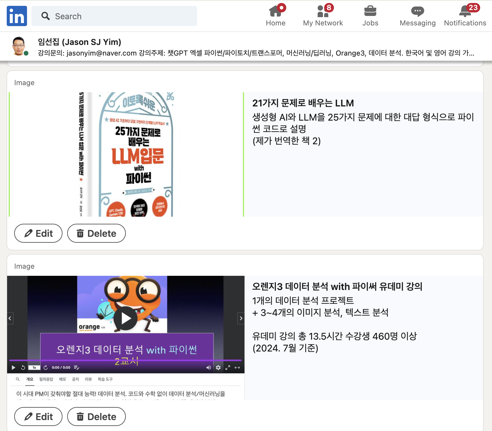 최근에 책들을 저술하거나 번역한 가지 수가 총 5종이 되고, 유데미에 온라인 강의도 2개 올라가 있어서 링크트인 실적 란을 업데이팅 해 놓고 보니 기분이 좀 좋아졌습니다. 지난 3년여간 많은 책을 썼구나 하고...스스로 대견해 해 봅니다.