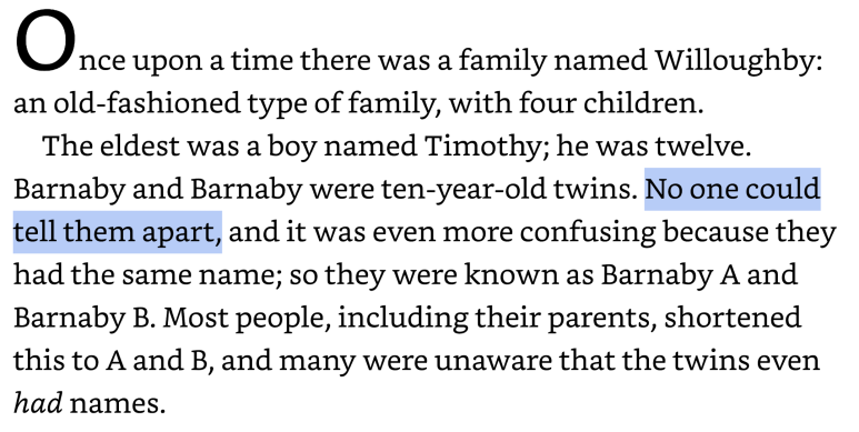 여기서 No one could tell them apart라는 표현에서 특히 tell them apart는 "구별해 낼 수 없다"는 뜻입니다. 사실 tell이 '구분하다'라는 뜻을 갖고 있다는 것을 알기 어려운데.. 이 표현을 하나 알아두면 좋습니다. 그래서 제가 좋아하는 Chicago 밴드나 에드가 앨런 포의 시 [애너벨 리]에 이런 표현이 있을 줄 알고 찾아봤는데 없더라고요. 제 기억의 오류^^